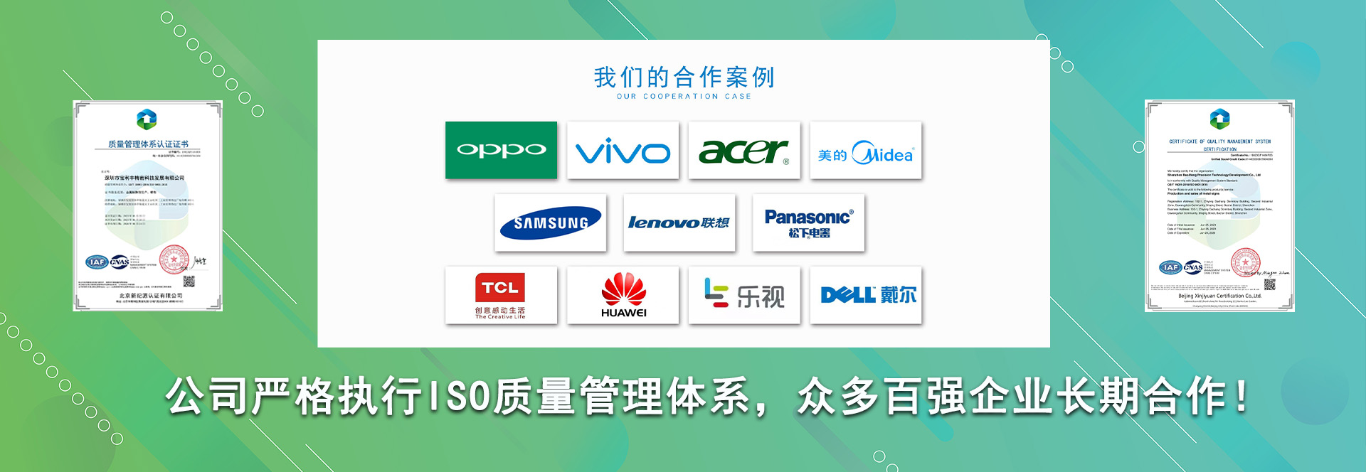 本公司與一些知名的企業都有合作,如:富士康、西鳳酒、茅臺、五糧液、恒旭包裝、聯想、華為、志高、建力高爾夫、東驊電腦、長城電腦等,我們真誠希望與您合作、為您服務。
